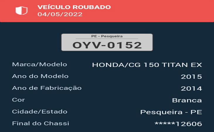 Dois elementos numa motocicleta praticar um assalto na noite de quarta-feira, 4, na Rua Zeferino Galvão, no centro de Pesqueira. A moto roubada foi uma CG 150 Titan de cor branca com placa OYV-0152.