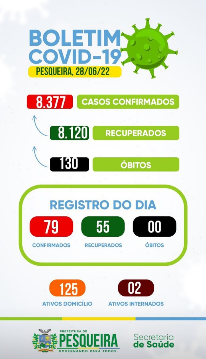 A Secretaria de Saúde informa aos munícipes o boletim da Covid-19 atualizado em 28 de junho de 2022.