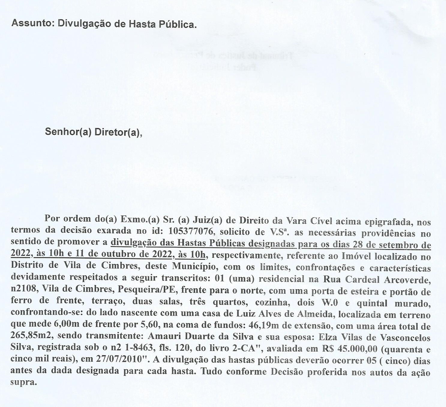 DIVULGAÇÃO DE HASTA PÚBLICA – LEILÃO DE UM IMÓVEL