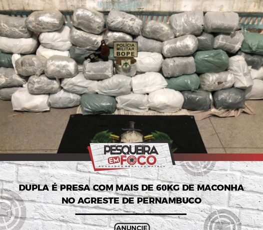 Em uma ação exitosa realizada por policiais militares do Batalhão de Operações Policiais Especiais (BOPE), nesta quarta-feira (04), dois indivíduos foram detidos com 63 quilos de maconha em Caetés, no Agreste de Pernambuco.
