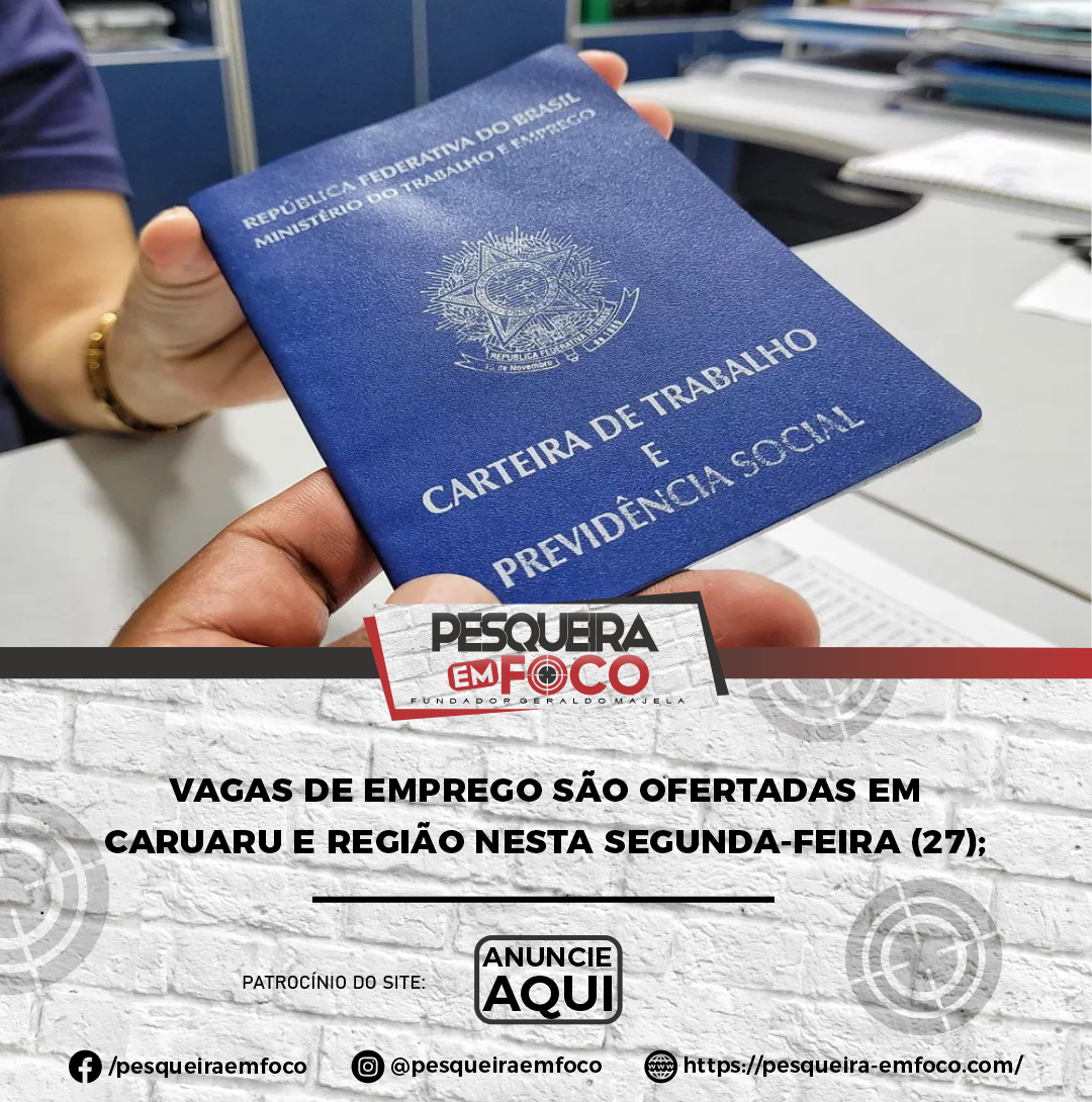 Confira as vagas desta segunda-feira (27) no site da Secretaria de Desenvolvimento Profissional e Empreendedorismo (Sedepe-PE) e na lista abaixo.