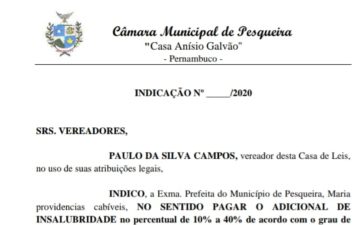 No início deste mês de maio, o vereador Wagner Cordeiro (presidente da Câmara Municipal de Pesqueira) solicitou a Prefeitura Municipal...
