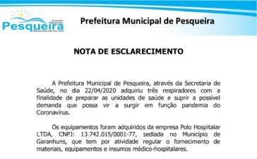 A Prefeitura Municipal de Pesqueira, através da Secretaria de Saúde, no dia 22/04/2020 adquiriu três respiradores com a finalidade de...